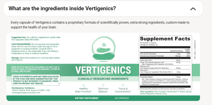 Vertigenics is a specialized formula designed to support your balance system so you can walk freely and with confidence. It’s a meticulously crafted natural solution that combines a variety of carefully chosen, extremely potent brain-supporting plants. Proudly manufactured in the USA with clinically researched ingredients, it features trust badges like GMP Certified, Natural Ingredients, FDA Registered Facility, and Made with Non-GMO Ingredients for ultimate reliability. In every capsule of Vertigenics, you’ll find an optimally dosed proprietary blend of nourishing ingredients that have been carefully mixed to complement each other in a powerful formula, targeting dizziness at its core for healthy brain function, optimum balance, and focus & concentration.